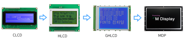 저희 컴파일에서는 아주 오래전부터 시리얼 디스플레이라는 제품군을 출시해왔습니다. RS232C (또는 I2C)와 같은 시리얼 통신으로 LCD를 제어하자 !! 라는 단순한 프로젝트였는데, HLCD (한글 LCD), GHLCD(그래픽과 한글)를 거쳐서 MDP (컬러 그래픽 LCD)까지 이르렀습니다.